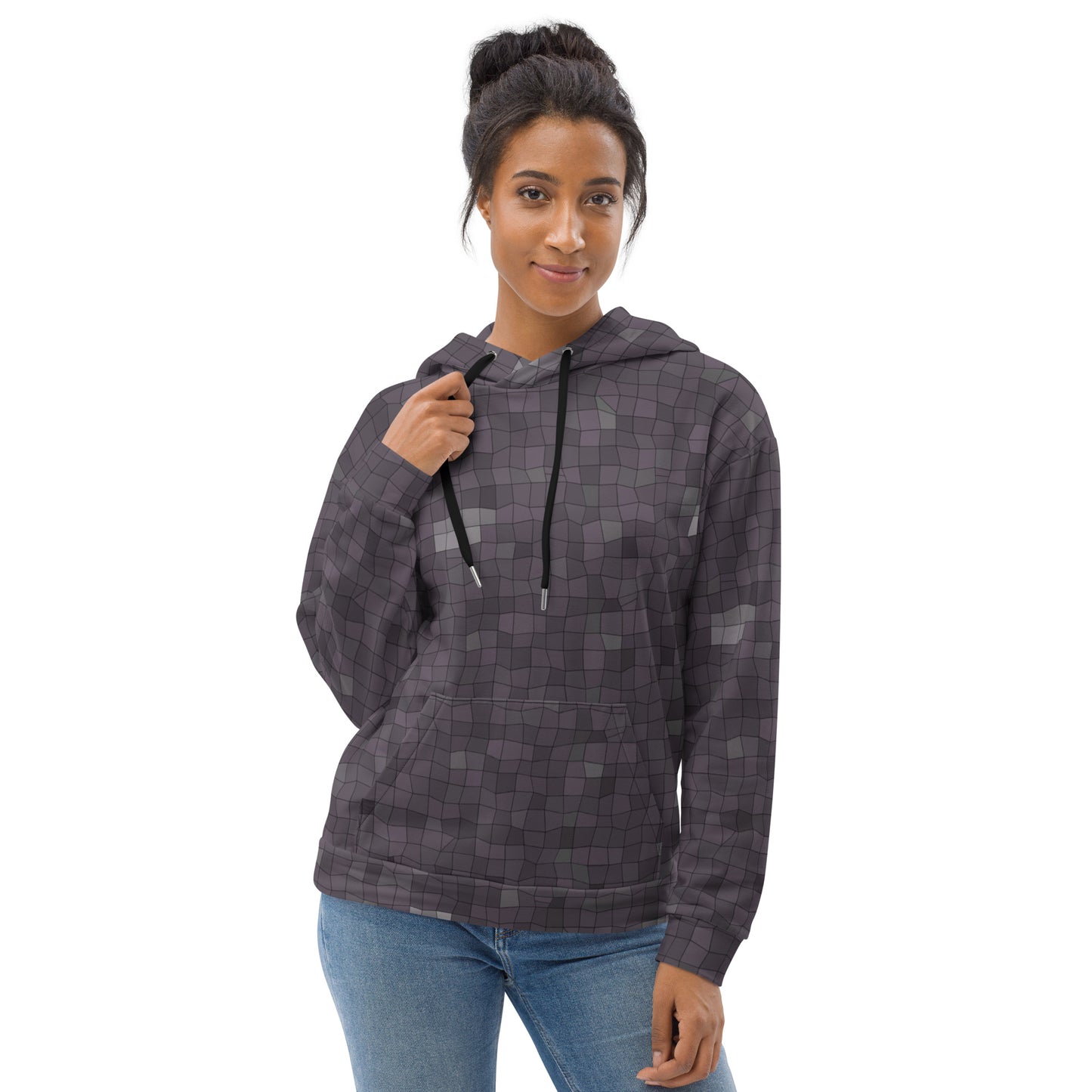 For when you just need to pull up your hood and disappear for a while. Mosaic pattern, unbothered energy. Emo, alt aesthetic with a muted edge. The hoodie has a smooth outside and a soft brushed fleece inside and a relaxed fit.