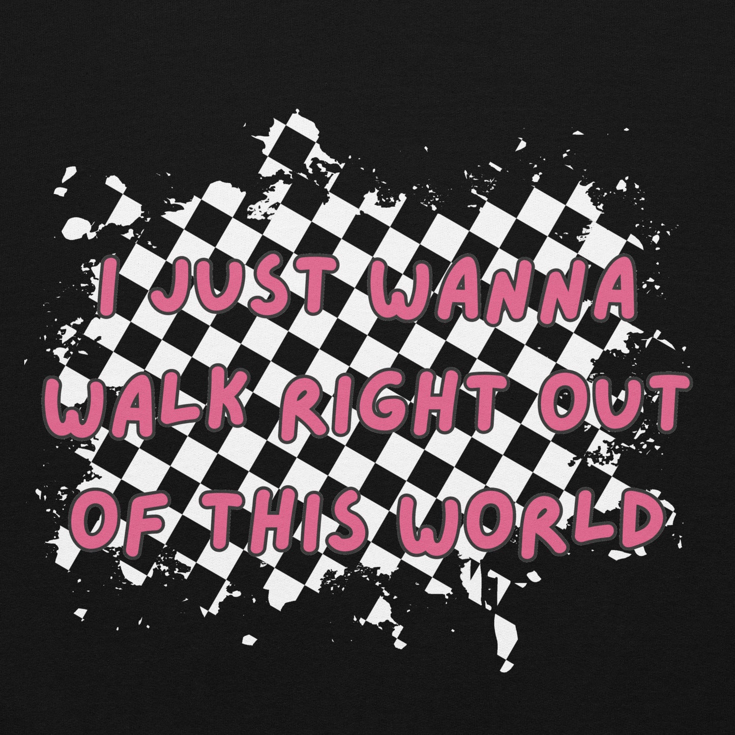 "I just wanna walk right out of this world." For the ones who feel everything too hard. For the quiet exits and long walks with loud thoughts. For punks, empaths, and those who don’t fit the algorithm. Inspired by punk legends and soft chaos, this black-and-checkered alt hoodie features: