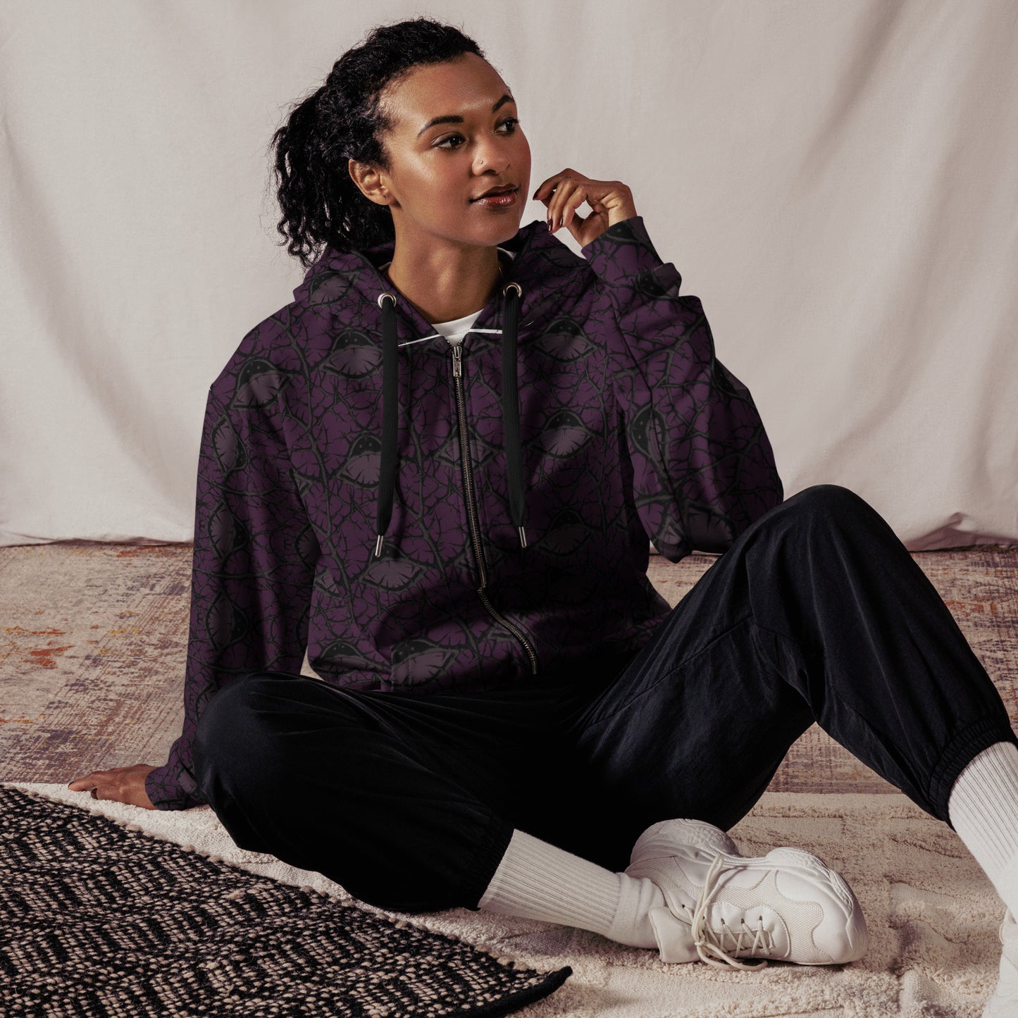 Distressed black thorns on rich violet. Hidden monster detail for the observant. Alt and emo aesthetic. A zip hoodie made from recycled polyester and designed to last for years to come.